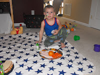 Andrew really wanted to have a picnic the other day, so we decided to have one in our living room. He picked out all the food and had the picnic blanket laid out. We had carrots, applesauce, turkey, and clementines. You will notice the bandaid under his eye. He said he wanted to have the carrots and ran back in the kitchen to get them. He was awful quiet, so I asked what he was doing and he told me nonchalantly that he was trying to open the carrots. Well, he brought them in and we started having our picnic. About 10 minutes later, his face had a little bit of blood on it. I asked him what he did and he said he poked himself with the knife when he was trying to get the carrotts open!?!??!! After picturing all the horrific things that could have happened to him, I yelled at him and had a good talking. I thought that we were past all the ages where the kids get into everything? He is just becoming a little dare devil. A few weeks ago, I was giving William a bath and I came out to find Andrew sitting at the top of the steps in a rubbermaid container getting ready to slide down. I stopped him, of course, and told him he would flip right over and he said "but doggie and blankie didn't", meaning he tried it with them first to see what would happen.